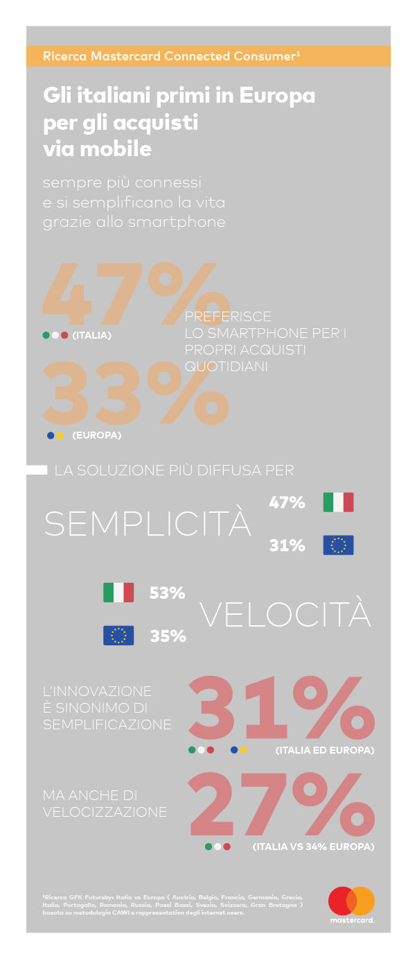 Lo studio Connected Consumer di Mastercard ha analizzato le abitudini e le attitudini dei consumatori italiani verso gli strumenti più innovativi e l’utilizzo delle tecnologie per migliorare l’esperienza di vita di tutti i giorni, non solo gli acquisti.