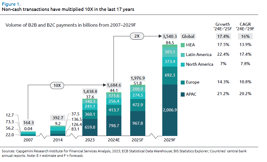 Il World Payments Report di Capgemini stima che il volume di transazioni non-cash a livello mondiale, che ha raggiunto quasi 1.685 miliardi nel 2024, sia destinato a toccare i 3.540 miliardi entro il 2029, riflettendo un tasso di crescita annuale composto (CAGR) del 16%. La regione Asia-Pacifico è in prima linea in questa crescita, con un CAGR previsto del 20,2% tra il 2024 e il 2029.
