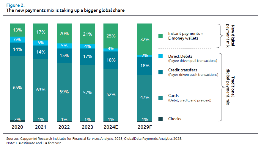 In termini di volume, le carte, che rappresentavano il 65% del totale non-cash nel 2020, dovrebbero scendere al 47% entro il 2029, mentre i pagamenti istantanei e i portafogli elettronici cresceranno significativamente, passando dal 13% al 32% nello stesso periodo.