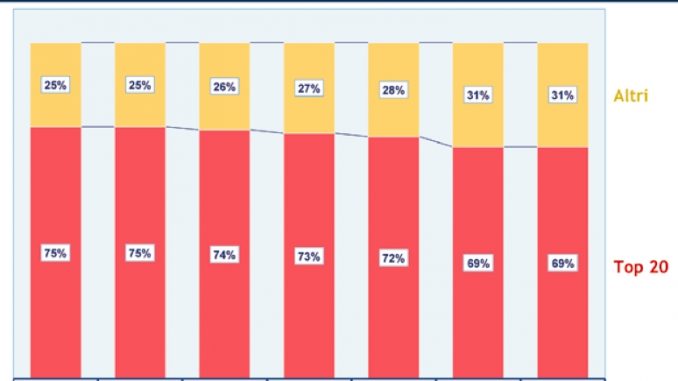 Il mercato eCommerce in Italia cresce, ma la concentrazione continua ad essere elevata: i primi 20 operatori, infatti, pesano per il 69% ed i primi 50 per l’88%.