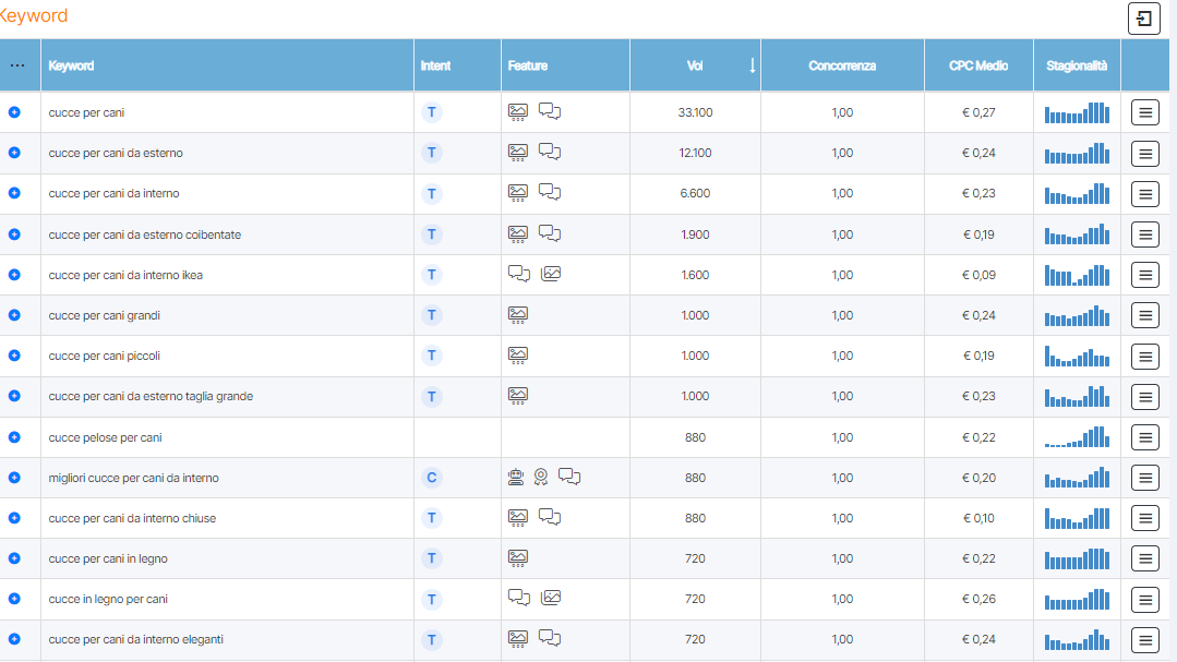 Quello che segue è un esempio di utilizzo di SeoZoom, per esplorare l’argomento “cucce per cani”.