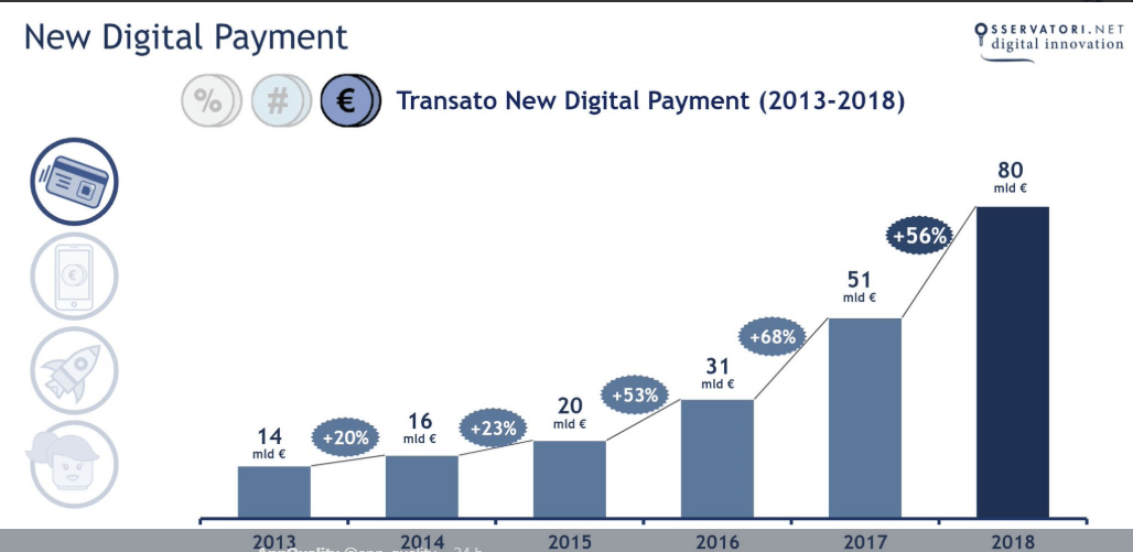Il report del Politecnico presta poi un’attenzione particolare a quello che al momento è un mercato ancora piccolo ma ricco di potenzialità, quello del mobile Payment, non fosse per altro per i nomi che sono scesi in campo, vale a dire Google, Samsung e Apple con i loro relativi servizi Pay: nel 2018 le transazioni di prossimità effettuate con questa modalità hanno raggiunto un valore di 530 milioni di euro, il 650% in più rispetto al 2017 (che però era stato sostanzialmente l’anno zero), con circa un milione di utenti. La previsione è che già entro il 2021 questo segmento possa raggiungere un valore compreso tra i 5 e i 10 miliardi di euro, ma perché queste stime siano confermate restano da superare alcuni ostacoli, tra cui la competizione con le carte contactless: la sensazione, confermata da una ricerca Kantar per il Polimi, è che non pochi utenti potenziali fatichino a percepire i vantaggi del pagamento su smartphone rispetto a quello su carta. Ovviamente c’è poi il tema dell’accettazione: il 60% dei piccoli commercianti ha dichiarato di non aver mai accettato pagamenti via mobile.