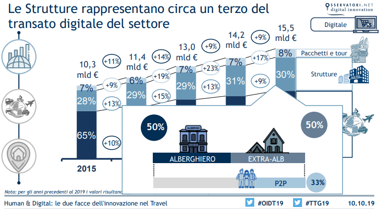 Nel 2019, su 100 prenotazioni nelle strutture, in media 49 vengono effettuate dal cliente finale direttamente (21 tramite una e-mail, 18 al telefono o al banco, 10 su sito, app e social network). La percentuale di prenotazioni dirette sale fino al 52% nel comparto alberghiero. Nel caso di strutture non tradizionali (come B&B, Agriturismi, Appartamenti, Camping), l’intermediazione digitale presenta dati sopra la media (38%). A trainare è la cosiddetta sharing economy (e più in generale tutte le piattaforme peer to peer nate per facilitare l’affitto e la condivisione di alloggio tra privati) che vale oggi un terzo della componente di mercato digitale relativa agli alloggi.