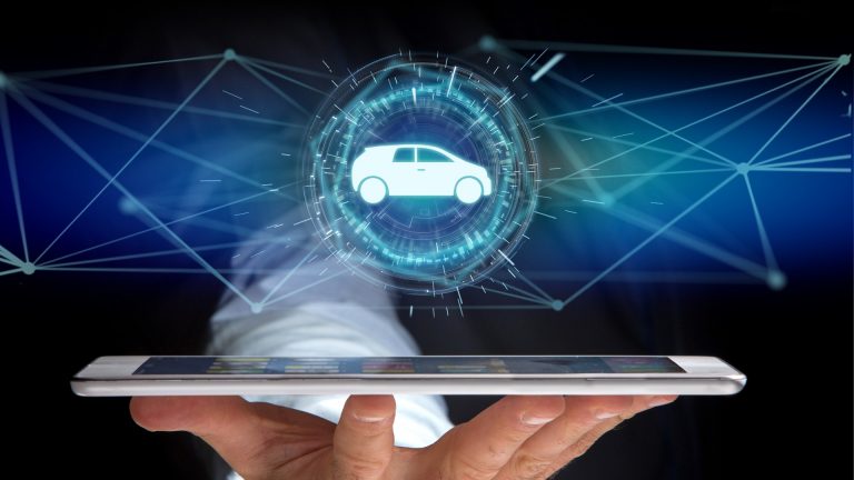 • pagoPA auto: mano con dispositivo da cui esce l'ologramma di un'auto digitale (concept PagoPa auto)