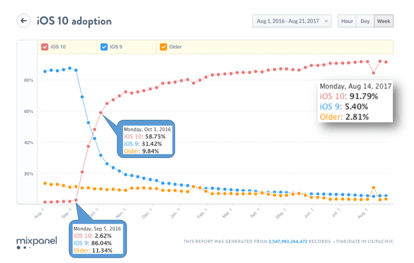 Come illustrato nella chart riportata di seguito (by MixPanel), l’adozione delle nuove versioni di iOS è estremamente rapida. Questo lascia poco tempo agli sviluppatori di applicazioni iOS per rispondere alle regressioni, alle problematiche funzionali e alle scarse esperienze d’uso dei loro clienti. È quindi altamente consigliato programmare cicli di test sfruttando la versione beta di iOS11 e valutare in anticipo la qualità della propria app.