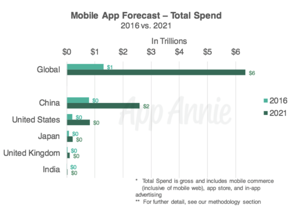 In questo arco temporale è previsto un raddoppio degli utenti da 3.4 miliardi di persone nel 2016 a 6.3 miliardi nel 2021 e cresce nello stesso tempo anche il tempo speso nelle app che passa dagli 1.6 trilioni di ore nel 2016 ai 3.5 trilioni nel 2021. L’altro grande dato che emerge e che segna l’importanza della App economy riguarda la spesa annuale per utente che passa da 379 a 1008 dollari.