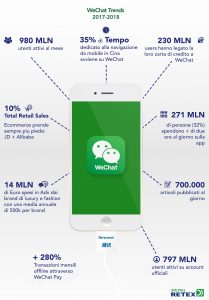 Per dare un’idea della diffusione di questa modalità di pagamento basti dire che nel corso del 2017 i consumatori cinesi hanno effettuato attraverso questa piattaforma un milione di transazioni al minuto. Al di là dei pagamenti online, per gli esercenti che vorranno abilitare questa modalità di pagamento sarà sufficiente dotarsi di un POS dedicato, oppure aggiungere WeChat Pay ai circuiti accettati in cassa. Quanto ai clienti, dovranno possedere un telefono e un account WeChat (980 milioni gli utenti attivi in Cina) collegato ad un conto per poter pagare via QR code. Tra i destinatari di questo servizio in prima linea sono i retailer, come moda lusso e design che rappresentano circa il 60% degli acquisti cinesi in Italia, senza sottovalutare l’impatto che il sistema di pagamento potrebbe avere sul mondo della ricettività turistica e dell’entertainment.