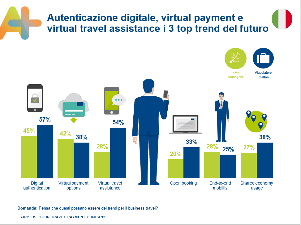 A questa crescita corrisponde anche un aumento delle aspettative sull’utilizzo di alcune tecnologie digitali considerate a supporto del business travel: la digital authentication in primis, l’utilizzo di carte virtuali, l’implementazione di assistenti virtuali, abilitati da strumenti di analytics e intelligence, nel corso del viaggio, nuovi strumenti di prenotazione, senza dimenticare asset chiave come la mobility e finanche strumenti tipici della sharing economy.