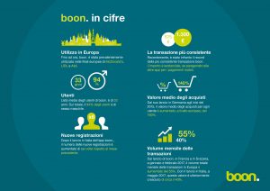 Fino ad ora, boon è stata utilizzata principalmente nelle filiali d’Europa di McDonald’s, LIDL e Aldi. L’età media degli utilizzatori è di 33 anni; il 94% degli utenti è di sesso maschile. Dal lancio del servizio, in Francia, a gennaio 2017, e in Svizzera, a febbraio 2017, è stata segnalata una crescita del volume mensile delle transazioni europee del 55%; con l’inaugurazione dell’app in Italia, a maggio 2017, il valore è ulteriormente salito del 40% (e il numero di registrazioni è aumentato di 6 volte). Dal lancio del 2015, in Germania, il valore medio degli acquisti per ogni utente ha registrato, in Europa, un incremento del 140%. I dati sottolineano l’orientamento verso i pagamenti mobili.
