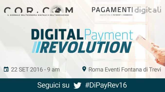 Per fornire un aggiornamento puntuale della situazione e per stomilare il confronto tra gli attori e individure problematiche e soluzioni CorCom e PagamentiDigitali.it hanno organizzato il convegno Digital Payment Revolution che si terrà a Roma il prossimo 22 settembre, Centro Congressi Roma Eventi Fontana Di Trevi – Piazza della Pilotta 4.