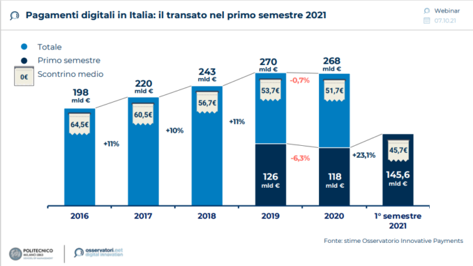 Un primo semestre 2021 di crescita per i pagamenti digitali in Italia, sulla spinta del Cashback e dei sistemi più innovativi: questa la principale indicazione che arriva dall’edizione semestrale dell’Osservatorio Innovative Payments della School of Management del Politecnico di Milano, presentato in occasione del webinar “I pagamenti digitali in Italia nei primi sei mesi del 2021”. I numeri raccontano infatti che nel primo semestre dell’anno il volume del transato attraverso il digitale, nonostante le chiusure parziali per effetto della pandemia, è aumentato del +23% rispetto allo stesso periodo del 2020, passando da 118 a 145,6 miliardi di euro e superando anche i numeri della prima parte del 2019. Tutto questo in un contesto di mercato in cui il noto attaccamento degli italiani per il contante sembra scemare: i prelievi di contante sono diminuiti del 3% in termini di operazioni e del 6% in termini di euro prelevati. Rispetto al primo semestre 2019, il calo è addirittura del 25% e 20%, rispettivamente per operazioni ed euro prelevati.