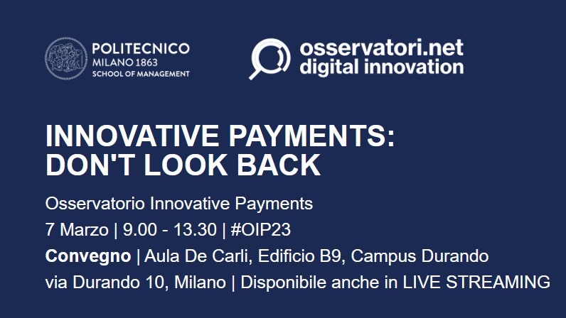 Esplorare tutti gli aspetti dell’innovazione che sta trasformando il mondo dei pagamenti all’insegna del digitale, fotografando la situazione attuale e tracciando la rotta dell’evoluzione dei sistemi di pagamento. È questo l’obiettivo dell’evento in programma martedì 7 marzo, nell’aula De Carli del Campus Durando di Milano (via Durando 10). Nell’occasione sarà presentata la ricerca “Innovative Payments: don’t look back”, realizzata dall’Osservatorio Innovative Payments della School of Management del Politecnico di Milano (questo il link per iscriversi).