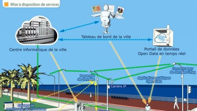 I dati raccolti tramite tali “oggetti”, siano essi sensori o smartphone, sono quindi processati e analizzati al fine di fornire informazioni sul contesto in tempo reale e abilitare diversi servizi (nell’immagine uno schema del funzionamento), il primo dei quali, rivolto agli automobilisti, sarà la fornitura di informazioni aggiornate sullo stato dei parcheggi, evidenziando quelli liberi e dando la possibilità di pagare a distanza tramite smartphone. Secondo la municipalità infatti ben il 25% del traffico di Nizza è dovuto alla ricerca di un parcheggio, ricerca che dura mediamente 25-30 minuti.