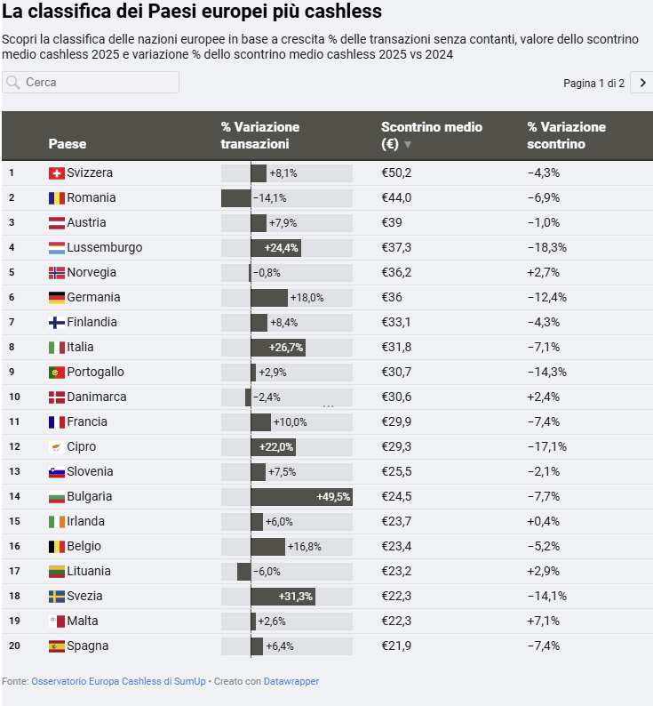 L’Italia conferma la propria vivacità nella transizione verso i pagamenti digitali. Secondo l’ultimo Osservatorio Europa Cashless di SumUp, nel 2025 le transazioni senza contanti sono aumentate del 26,7%, posizionando il Paese al terzo posto in Europa. Davanti all’Italia si trovano solo Bulgaria (+49,5%) e Svezia (+31,3%), mentre mercati tradizionalmente avanzati come Germania e Belgio registrano incrementi più contenuti.