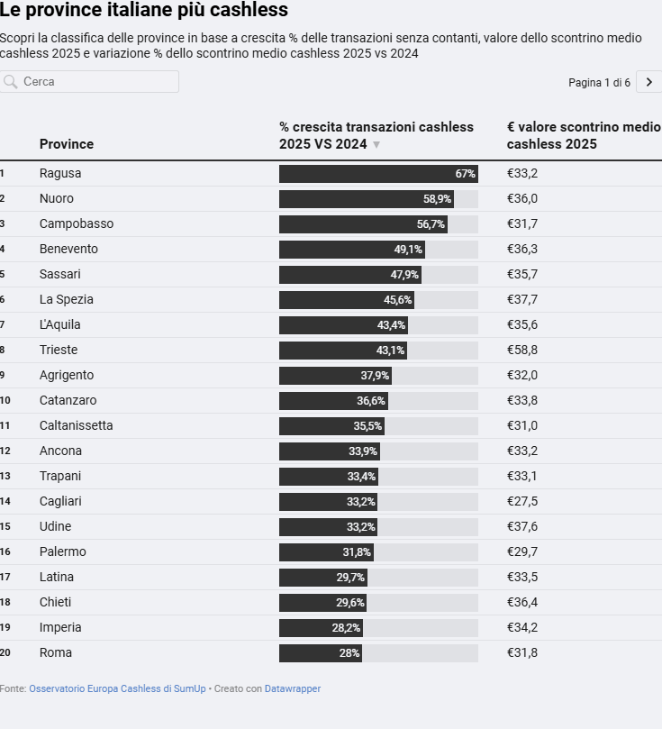 La diffusione dei pagamenti digitali non riguarda solo le grandi città: tutte le province italiane mostrano una crescita positiva delle transazioni cashless. In testa ci sono Ragusa (+67%), Nuoro (+58,9%) e Campobasso (+56,7%), seguite da Benevento (+49,1%), Sassari (+47,9%) e La Spezia (+45,6%). Chiudono la classifica L’Aquila (+43,4%), Trieste (+43,1%), Agrigento (+37,9%) e Catanzaro (+36,6%).