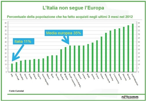 L’Italia resta il fanalino di coda d’Europa per quanto riguarda l’uso di Internet e lo sviluppo dell’e-commerce. Questo si legge nei dati di Eurostat presentati in occasione del recente evento InternetDays di Milano, secondo i quali oltre un terzo degli italiani (37%) non usa internet, contro una media europea del 22%. Solo l’11% dei connazionali fa acquisti in rete, contro una media europea del 35%.
