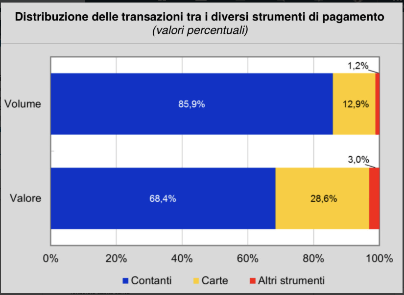 Gli strumenti alternativi al contante più diffusi sono le carte di pagamento (di debito, di credito, prepagate) con le quali sono state regolate il 12,9 per cento delle transazioni (28,6 per cento in valore). Ancora limitata, invece, la tecnologia contactless, impiegata solo per il il 3 per cento delle transazioni con carte: il 49 per cento degli intervistati ha dichiarato di non possedere una carta o uno smartphone con cui poter utilizzare questa funzione; il 23,2 per cento di possederla ma di non utilizzarla, mentre un 20 per cento adopera questo strumento almeno una volta al mese. Complessivamente, insomma, il 72 per cento del campione non utilizza la tecnologia contactless, un dato anche in questo caso superiore rispetto alla media registrata su scala europea (in media 62 per cento non utilizzatatori).