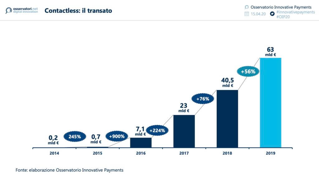 Certamente un bell’aiuto, come abbiamo visto, arriva dall’effetto Contactless che come sottolinea Valeria Portale, Direttore dell’Osservatorio Innovative Payments sta conquistando i consumatori non solo come alternativa alle modalità di pagamento classiche con carta, ma nel rispetto degli obiettivi di questa soluzione, come sostituzione del contante. Il volume di questi pagamenti inizia ad essere molto importante ed è passato dai 40,5 miliardi di euro del 2018 ai 63 miliardi di euro del 2019 ma il dato forse più significativo è da leggere nella relazione tra la crescita nel numero delle transazioni, che con il 67% arrivano a superare il miliardo e mezzo, e nella diminuzione del valore medio di ciascuna transazione da 45€ a 42€ a testimonianza, come evidenziato da Valeria Portale, che i consumatori stanno utilizzando il contactless come comoda e facile sostituzione del contante e come veicolo di estensione dei pagamenti digitali.