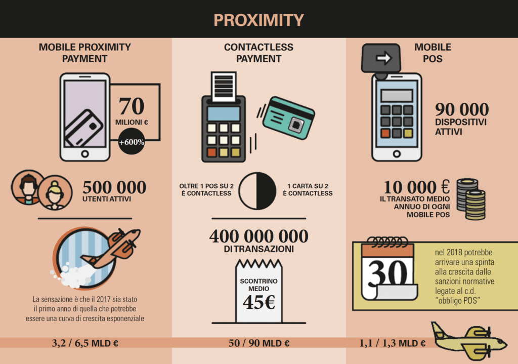 Così come il fenomeno del Mobile Proximity Payment, forse ancora circoscritto a 500.000 utenti attivi ma con un tasso di crescita del 600% che lascia ben sperare nella crescita del perimetro di business che nel nel 2017 è arrivato a 70 milioni di euro.