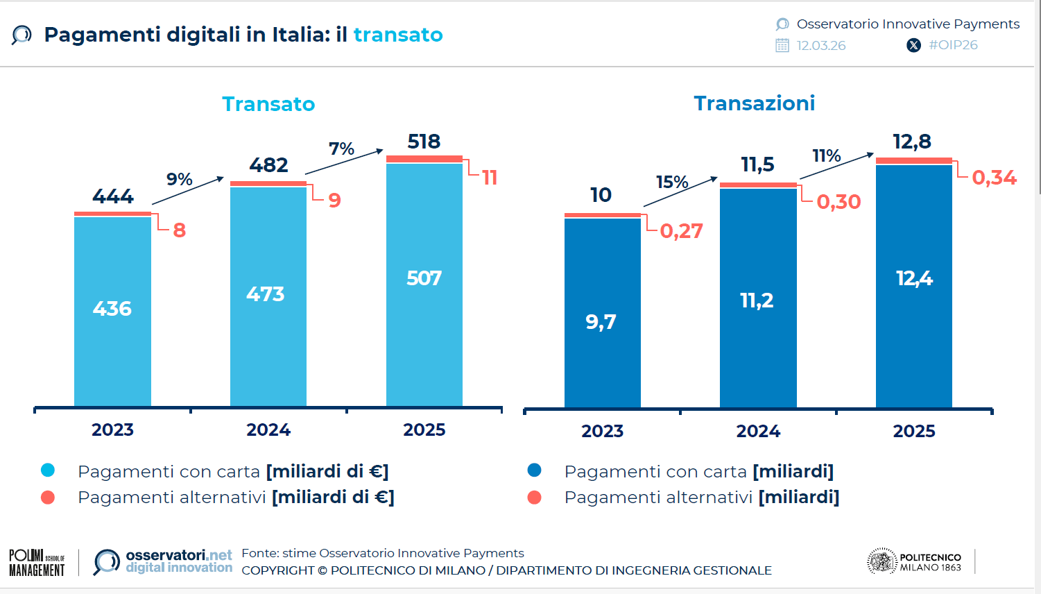 Secondo la ricerca dell’Osservatorio Innovative Payments del Politecnico di Milano, nel 2025 il valore dei pagamenti digitali in Italia ha raggiunto i 518 miliardi di euro, segnando una crescita del 7% rispetto al 2024.
