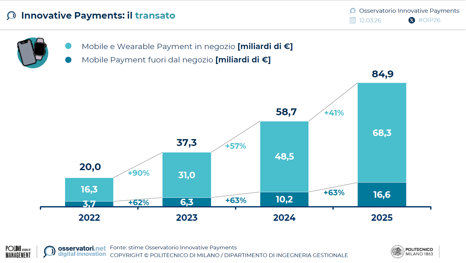 Nel complesso, gli innovative payments hanno generato 84,9 miliardi di euro, in crescita del 45% rispetto al 2024, coprendo il 16% del totale dei pagamenti digitali. La carta fisica resta diffusa, ma non è più l’unico strumento di pagamento: smartphone e wearable stanno diventando l’interfaccia principale delle transazioni.
