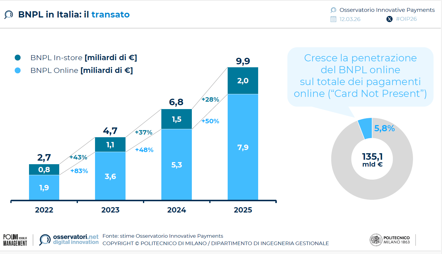 Un’altra tendenza significativa riguarda il Buy Now Pay Later (BNPL), che nel 2025 ha raggiunto in Italia 9,9 miliardi di euro di transato, con una crescita del 45% su base annua. La spinta principale arriva dall’e-commerce, dove questa modalità di pagamento è cresciuta del 50%.